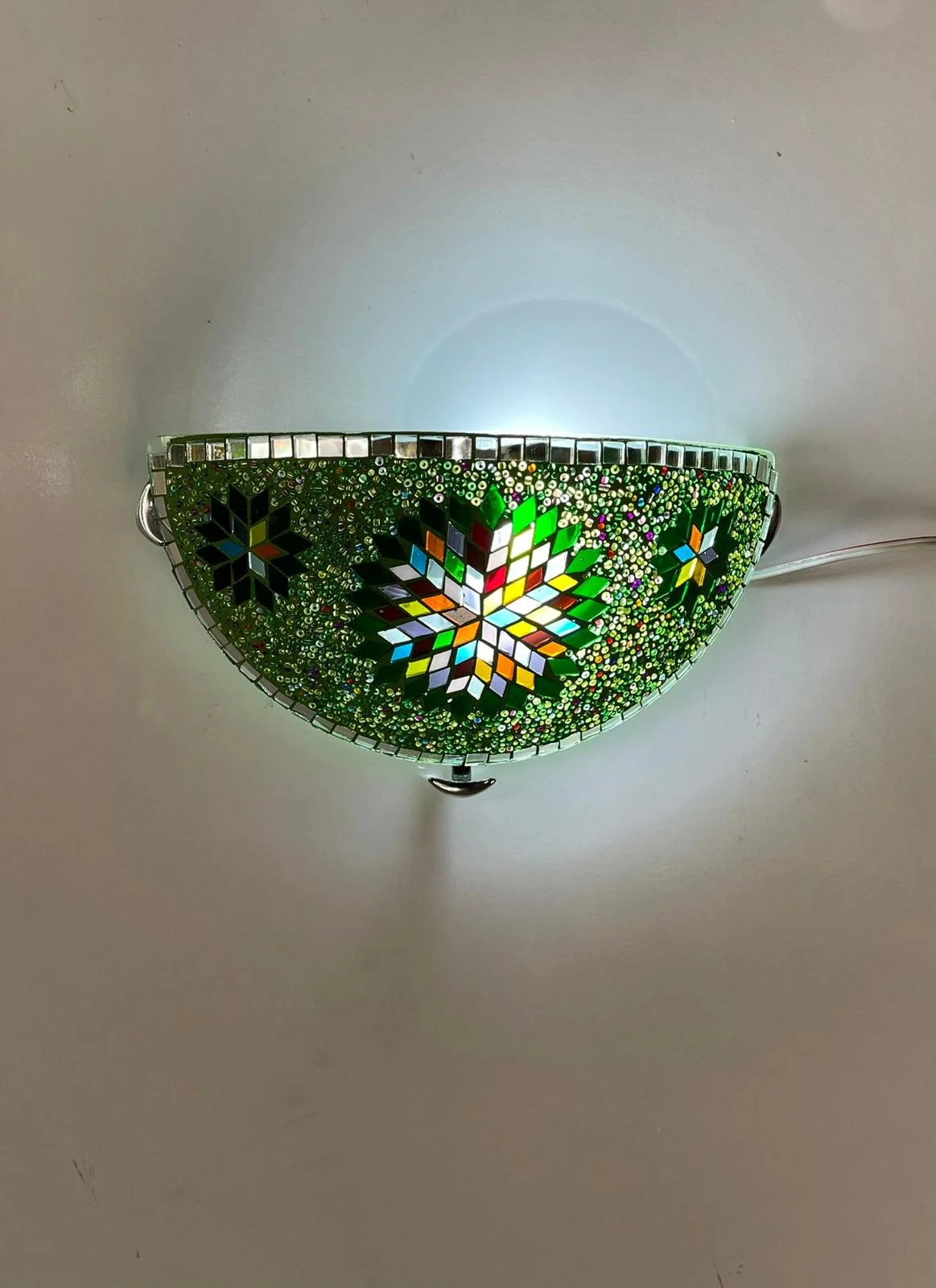 The centerpiece features a geometric “Star” motif, surrounded by intricate beads that diffuse light with warmth and softness. The upper rim is detailed with square mirror tiles, adding an extra touch of sparkle.